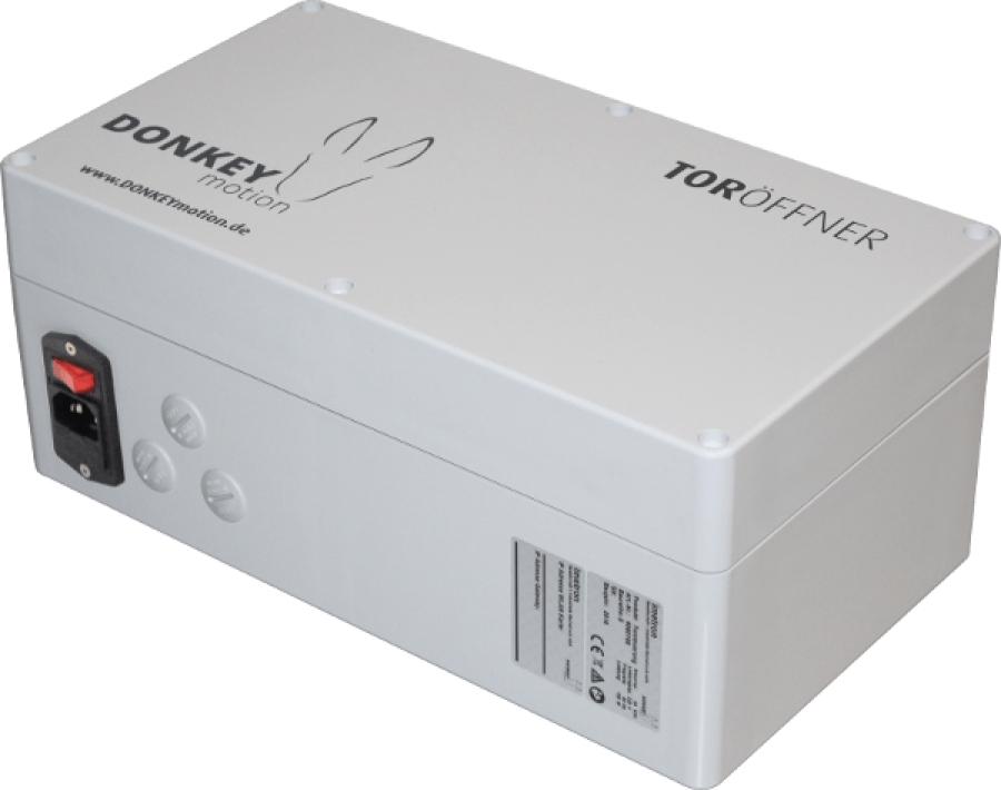 Der Toröffner emöglicht Tore und weitere Infrastrukturkomponenten wie beispielweise Aufzüge durch die CALL THE DONKEY-Leitsteuerung zu betätigen. Der Toröffner wird mit galvanisch getrennten, digitalen In- und Outputs mit der Steuerung der Infrastrukturkomponente verbunden. Die Kommunikation mit der Leitsteuerung erfolgt per WLAN.