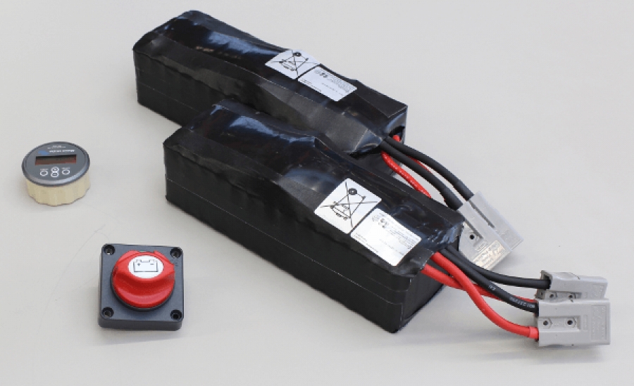 Batteriesatz bestehend aus 2 Stk. Lithium-Ionen-Akkupack, Kabelsatz, Batteriewächter, Sicherung und Batterietrennschalter. Satz: 24 V / 42 Ah -> 1.008 Wh. inkl. Batterie-Schutzschaltung und passivem Ladebalancing.