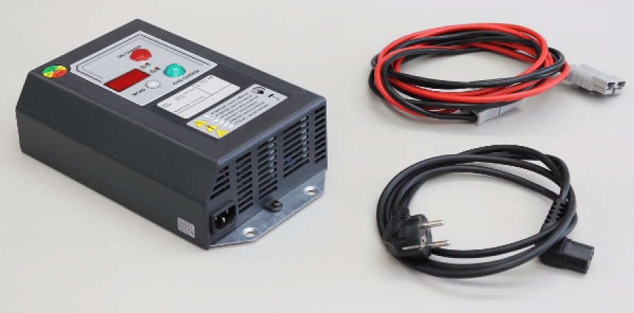 Effizientes, batterieschonendes HF-Ladegerät. Voreingestellt mit konfektioniertem Kabelsatz zum Laden von diversen DONKEYmotion-Systemen mit Li-Ionen-Akkupacks.